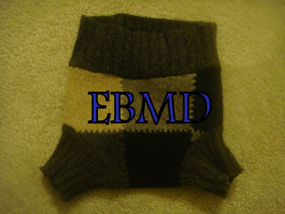 Laura sent us the 100% lambswool soaker made out of a gray, black and cream blend patchwork type sweater. You can see that the back of the soaker is slightly higher to allow for a bulky cloth diaper and still have baby’s tush covered.