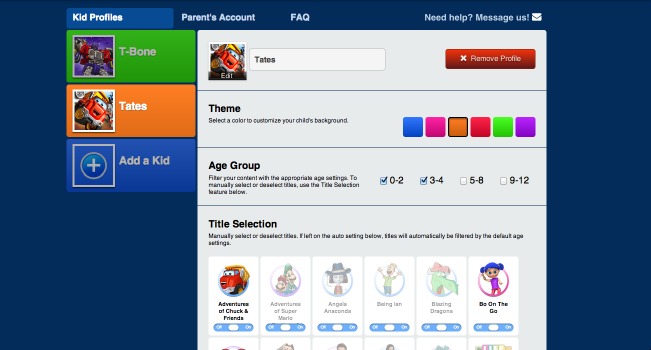 Parent’s have complete control over what each child has access to watch via the easy to use Parents Room where you can tailor content to your child’s needs including age category filtering and title selection and de-selection. I really love being able to set separate parameters for Tates and T-Bone within Kidoodle.TV and not have to worry about what they are watching. Allowing both boys to have the freedom and diversity of Internet access but with parameters built in to ensure their safety is a wonderful feeling.